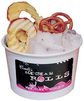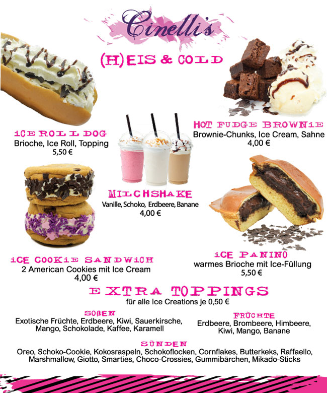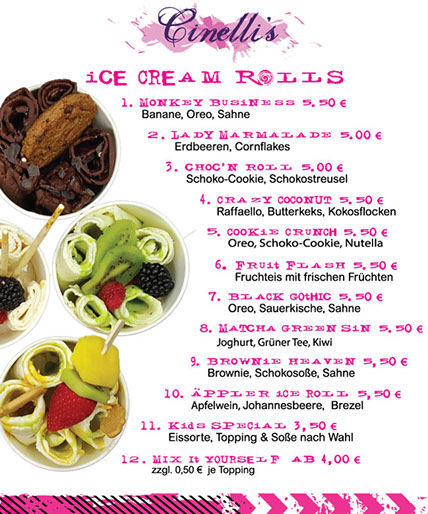 CINELLI's steht für innovative Eisprodukte und revolutioniert die eiskalten Gaumenfreuden. Absoluter Star sind unsere ganz speziellen CINELLI`s Ice Cream Rolls, die nach original italienischen Rezepten hergestellt werden, sind vergleichbar mit einer Art Crêpe, hauchdünn und crispy zugleich, aber natürlich eiskalt. Die sinnlich zarten Röllchen sorgen durch die Melange aus Eis und Zutaten wie Cookies oder frischen Früchten für ein wahrhaftiges Geschmackserlebnis.